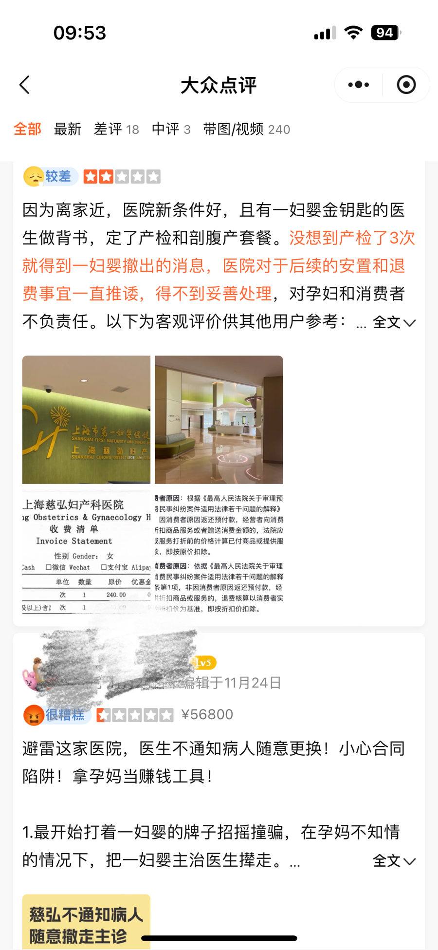 “我们当初选择慈弘妇产科医院,就是因为背靠一妇婴医疗团队资源。”近日,多名与上海慈弘妇产科医院(以下简称“慈弘”)签约的孕妇向“新民帮侬忙”求助。11月中旬,她们被突然告知上海市第一妇婴保健院(以下简称“一妇婴”)全体医护人员撤出慈弘,导致原定由一妇婴医生提供的孕期服务无法继续。“我们一直被蒙在鼓里,更打乱了我们预定的生产计划。”如今,事发近一个月,慈弘仍未给出明确说法,被指“毫无诚意”的退费方案更让众多孕妇及家属心寒。