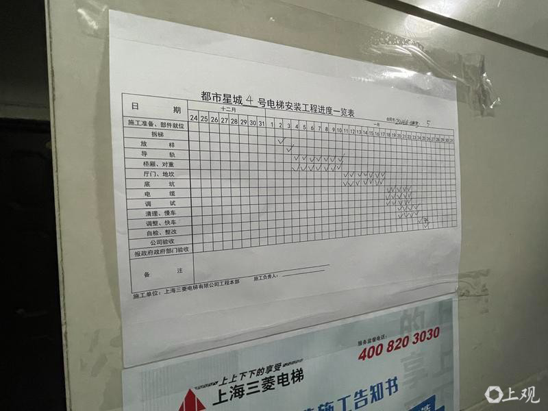 让龚先生尤为不满的,是施工过程中的“服务缺位”。他告诉记者,电梯停用前,居民并未收到明确的工期告知,对施工进度完全“一头雾水”。更令他疑惑的是,去年12月8日旧电梯拆除后,施工队直至12月16日才开始安装新电梯,“这8天时间,施工队到底在做什么?是否存在提前停电梯却拖延施工的情况?”带着这些疑问,龚先生向“新民帮侬忙”栏目求助,希望施工方作出合理解释。